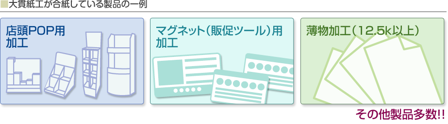 また、スチレンボードやミラーボードといった板材も数多く取り揃えていますので、POP等、お客様のニーズに応じて幅広い合紙加工を行うことができます。