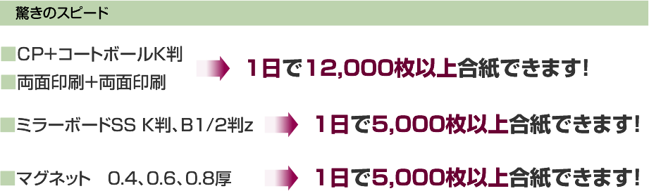 B/D K判-16k、E/D L判-23.5k以上は1回で3枚合紙が可能。難易度の高い合紙もスピーディーに対応いたします。